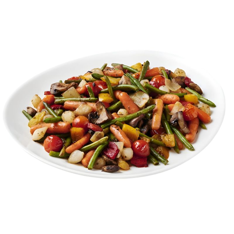 Legume 90% (fasole verde, morcovi baby, rosii cherry, ciuperci la grill, ceapa la grill, ardei rosu si galben la grill), sos 10% (ulei de cocos, mix de condimente, sare, sirop de glucoza, ierburi, sos de SOIA (boabe de SOIA, sare, otet din brandy), otet balsamic de Modena, 18% (otet din vin, must de struguri), apa, busuioc, amidon din porumb, usturoi, caramel.