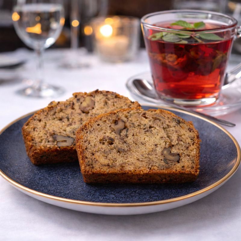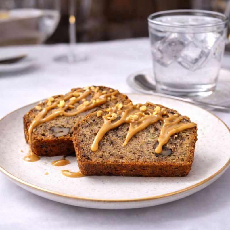 Banane 56 %, faina alba de GRAU, zahar brun, suc de portocale, ulei de cocos, ulei de floarea soarelui, bautura pe baza de plante (apa, proteina din SOIA, orez, ulei vegetal de rapita, OVAZ, MIGDALE, acidifianti: fosfat de potasiu, carbonat de calciu, sare de mare, aroma naturala, vitamina D, vitamina B2-riboflavina, vitamina B12), NUCA* 8%, seminte de chia 5%, praf de copt, bicarbonat de sodiu, sare neiodata, otet din VIN alb, esenta de vanilie. Contine GLUTEN, SULFITI SI DIOXID DE SULF.