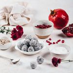 Bomboane din curmale, cacao si rodie, decorate cu fulgi de cocos - magia dintre gustos si sanatos. Produs crud - raw vegan. Energy Balls - energizante, cu aroma de curmale, cacao si pudra de roscove. Dulceata stafidelor si gustul acrisor al rodiei creeaza o combinatie de gust irezistibila.