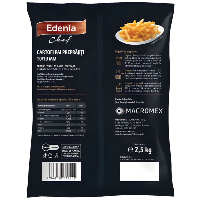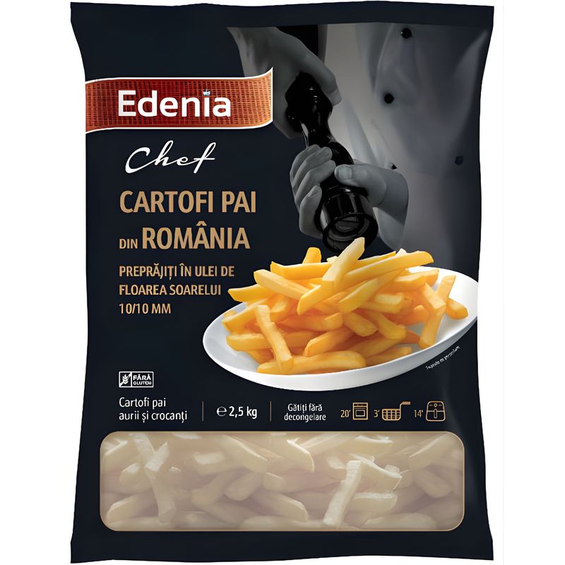 2-3/14 min * 175/180°C: Friteuza clasica: Preincalziti uleiul pana la 175 °C si adaugati cartofii congelati direct in uleiul incins. Prajiti timp de 2-3 minute, pana cand capata o culoare brun aurie. Friteuza cu aer cald: Asezati cartofii pai congelati in friteuza cu aer cald si gatiti la 180 °C timp de 14 minute. Intoarceti cartofii la jumatatea timpului de gatire.