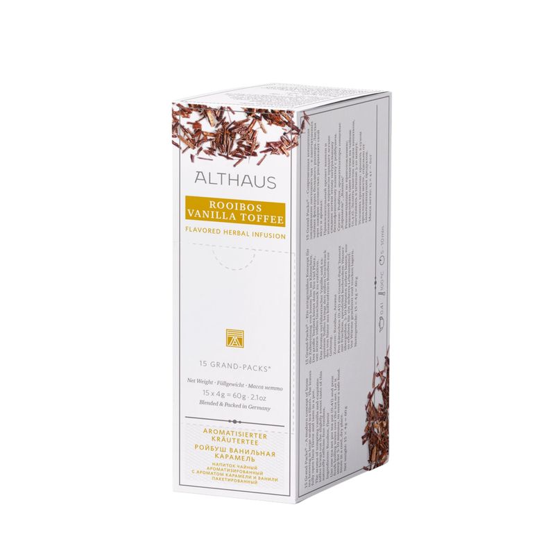 Ceai cu gust usor dulce de rooibos natural, fara cofeina, cu arome de vanilie. Cutia contine 15 plicuri, un plic 4g.
