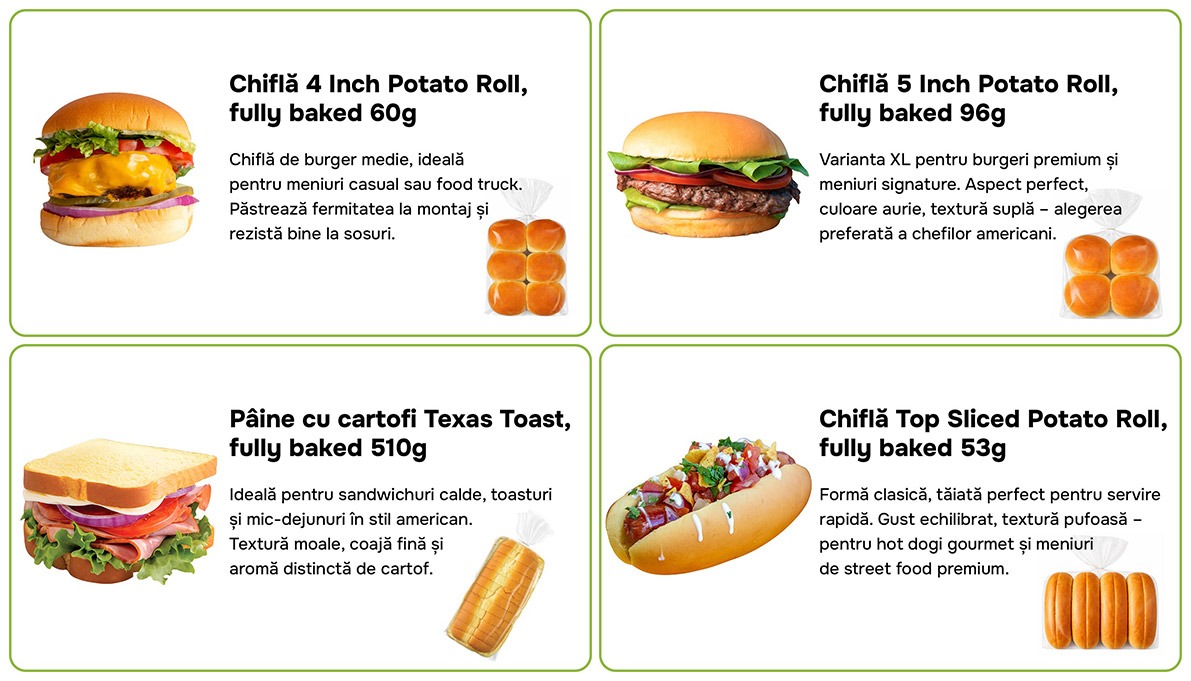 Chiflele Martin’s sunt preparate cu faina de grau cu continut ridicat de proteina, lapte degresat, cartofi, zahar din trestie de zahar, drojdie, ulei de floarea-soarelui si unt, care ofera textura inconfundabila – moale, elastica si usor dulce. Fiecare chifla este coapta lent, pentru a pastra culoarea aurie si structura perfecta, ideala pentru burgeri gourmet sau hot dogi artizanali. Produsele sunt fully baked si gata de utilizare – ideale pentru bucatarii cu flux rapid, unde fiecare minut conteaza.