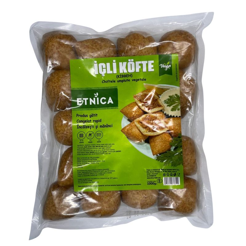 Icli Kofte-Kibbeh - chiftele vegane umplute cu legume si condimente in invelis de bulgur fin. Pot fi servite ca aperitiv cald, fel principal sau gustare rapida, alaturi de salate, sosuri orientale, garnituri sau lamaie. Reteta este inspirata din bucataria traditionala turceasca, reinterpretata intr-o varianta moderna, de post, fara ingrediente de origine animala, apreciata de vegani si de toti cei care adopta un stil de viata echilibrat. Produs preparat, congelat rapid, produs ready to heat, o punga contine 15-16 chiftele, temperatura de depozitare -18 grade Celsius. Valabilitate: 12 luni de la data fabricatiei.