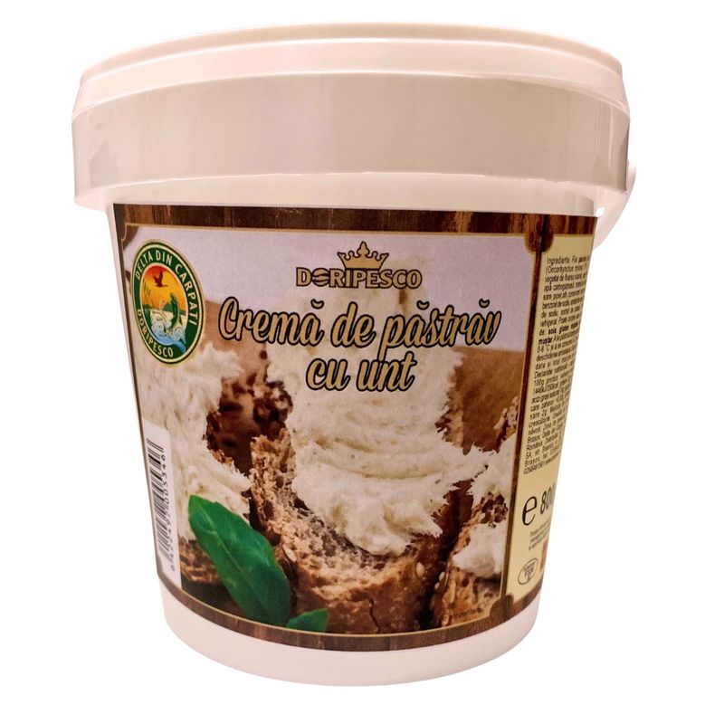Crema de pastrav cu unt este un preparat rafinat, obtinut din file de pastrav fin maruntit si amestecat cu unt de calitate superioara, pentru o textura cremoasa si un gust bogat, catifelat. Produsul pastreaza aroma autentica a pastravului, echilibrata perfect de untul fin, rezultand o crema delicioasa, potrivita pentru tartine, aperitive sau bufete reci.