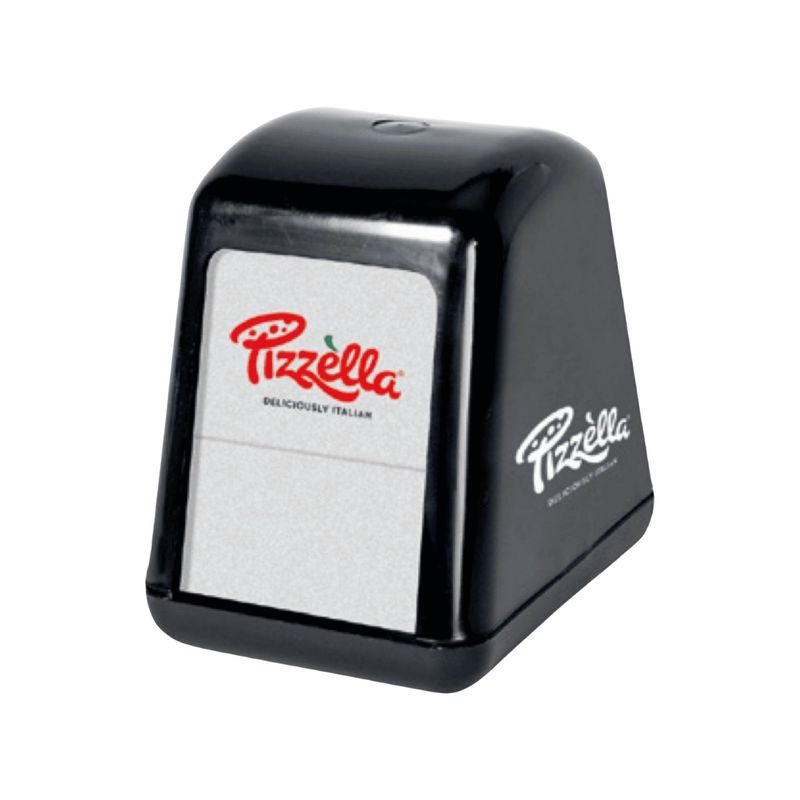 Dispender reincarcabil pentru servetele, tip „napkin holder”, cu carcasa neagra si panou frontal metalic, branduit Pizzella. Potrivit pentru mese si bar, tine servetelele protejate si usor accesibile, cu reumplere rapida.