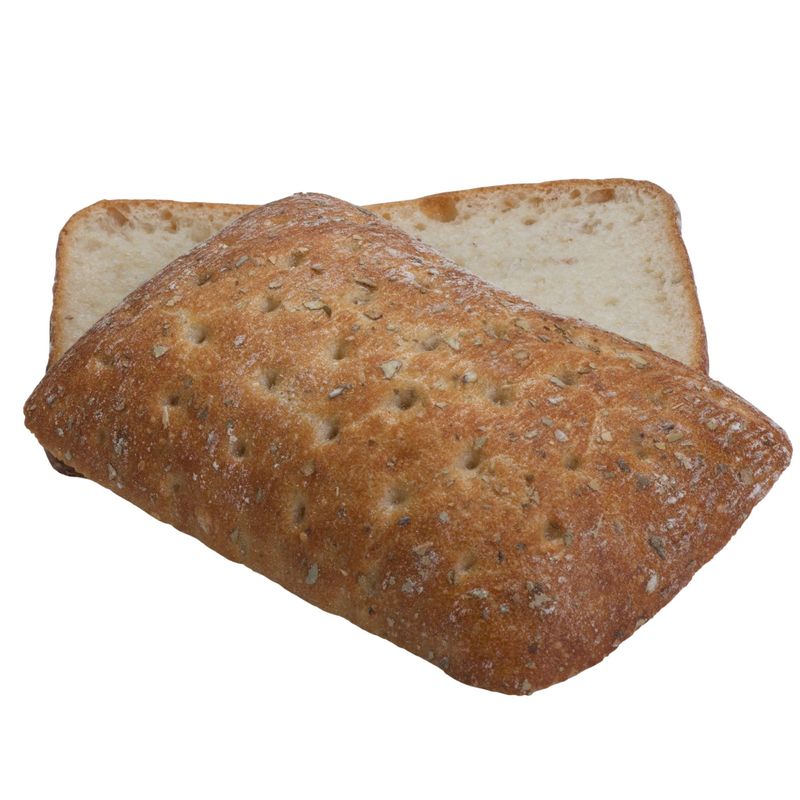 Faina alba de GRAU (Origine Romania), apa, ameliorator de panificatie (faina alba de GRAU 550, GLUTEN de GRAU, maia de GRAU dur, acid ascorbic, enzime, cisteina), sare iodata, ulei de masline (ulei din turte de masline), drojdie de panificatie, mix condimente (oregano, rozmarin), maia din GRAU (apa, faina dietetica integrala de GRAU, cultura starter, drojdie).