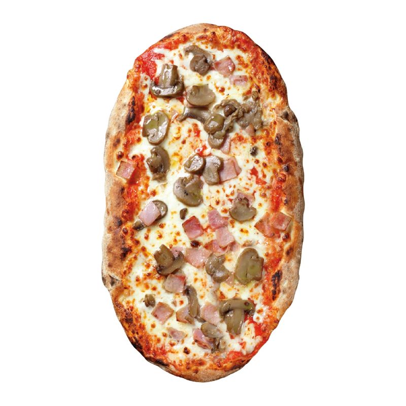 Faina de GRAU, apa, MOZZARELLA, pulpa de rosii, sunca 6.7%, aroma de fum, extract de condimente, ciuperci champignon taiate si calite 6.7%, ulei vegetal, sare, drojdie uscata, faina de GRAU maltuit, germeni de GRAU, ulei de masline extravirgin.