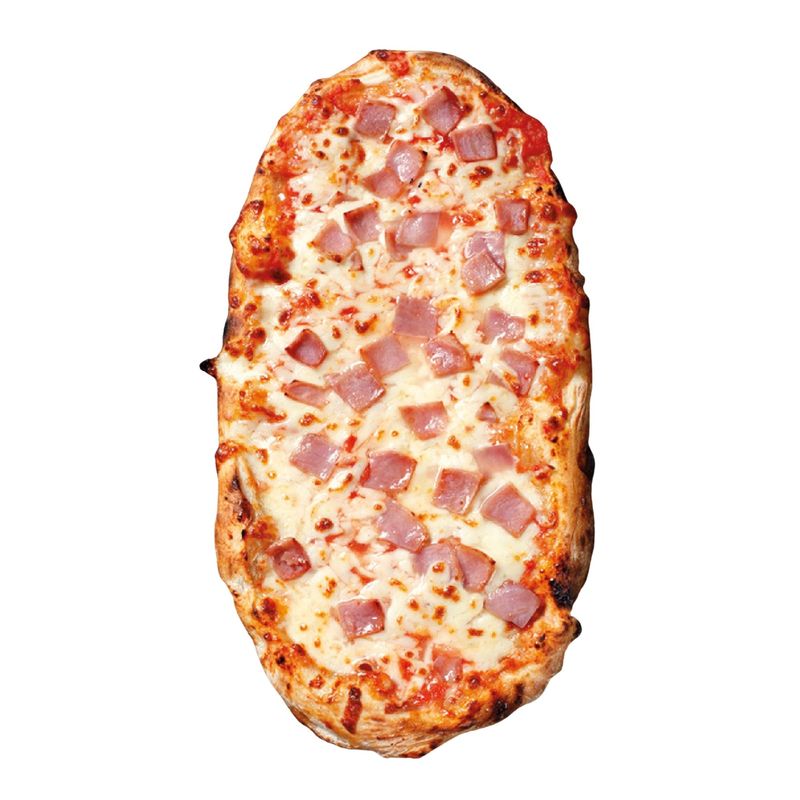 Faina de GRAU, apa, MOZZARELLA, pulpa de rosii, sunca 11%, aroma de fum, extract de condimente, aroma, ulei vegetal, sare, drojdie uscata, faina de GRAU maltuit, germeni de GRAU, ulei de masline extravirgin.
