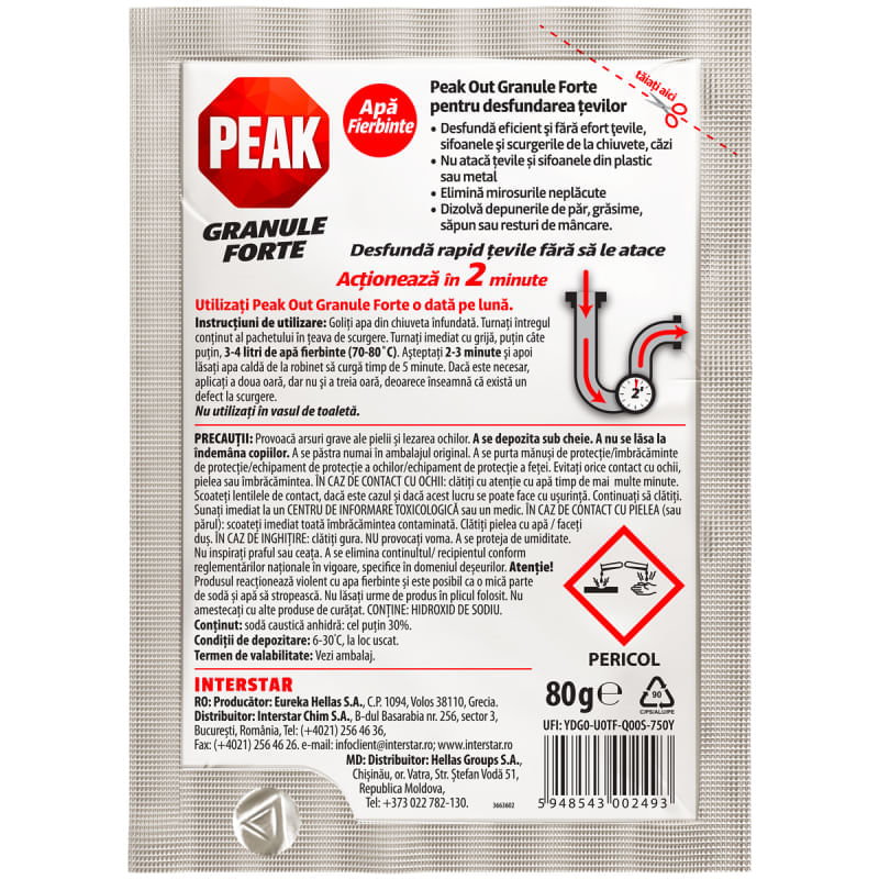 Peak granule forte pentru apa fierbinte desfunda rapid si fara efort tevile, sifoanele si scurgerile de la chiuvete, cazi. Nu ataca tevile si sifoanele din plastic si metal. Elimina mirosurile neplacute si dizolva depunerile. Actioneaza in 2 minute.