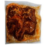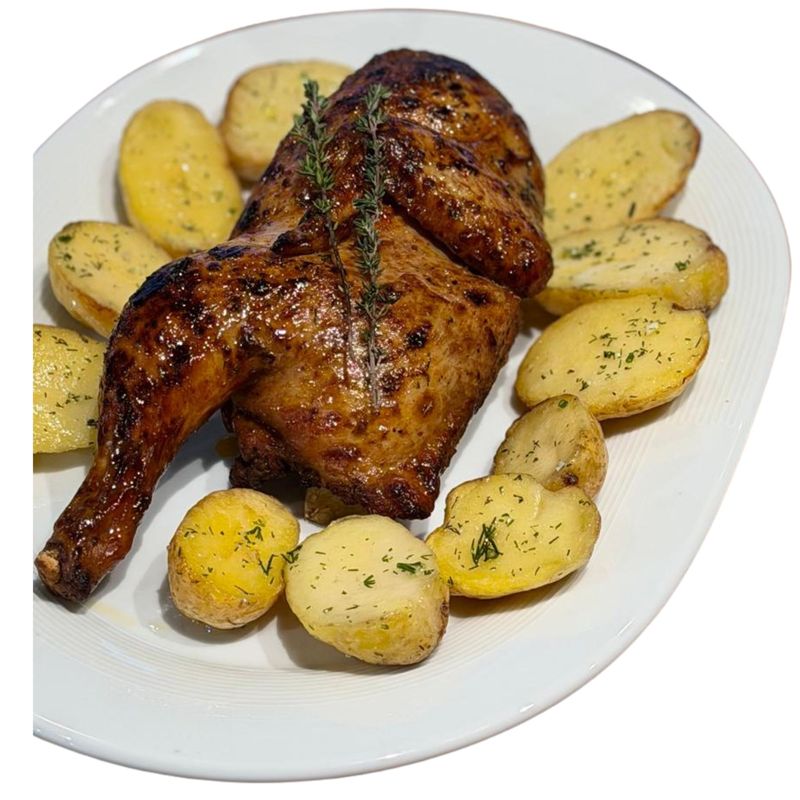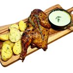 Jumatate de pui condimentat cu piper, boia afumata, coriandru, schinduf, chimion, ghimbir, ardei iute, usturoi, gatit sous-vide. Produs congelat, fabricat in Romania. In pachet sunt 2 jumatati.