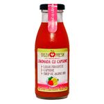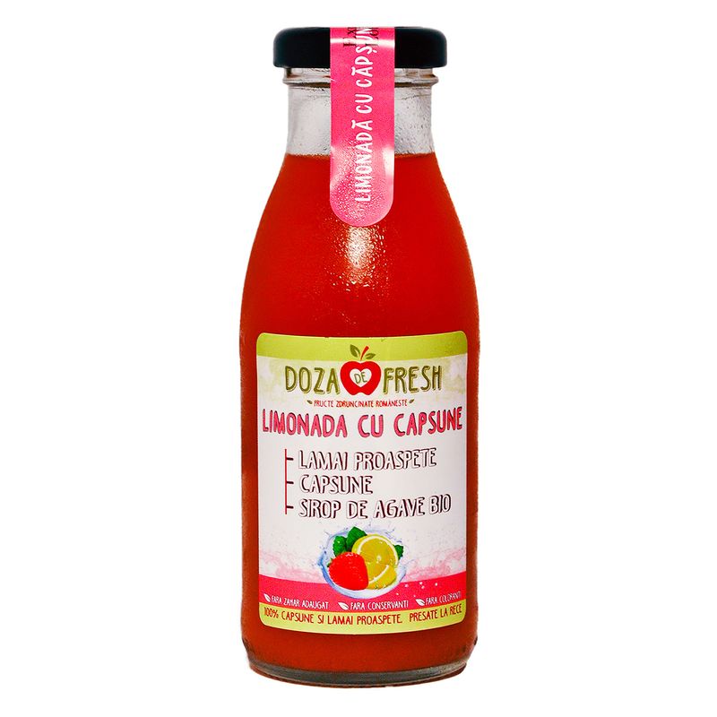 Limonada naturala din lamai proaspete presate la rece. Produs usor pasteurizat si imbuteliat in ambalaj de sticla de 250ml, cu termen de valabilitate de 90 de zile. Fara adaos de zahar, fara concentrat, fara coloranti, fara aditivi. Contine: lamai, capsune, sirop de agave, apa purificata.