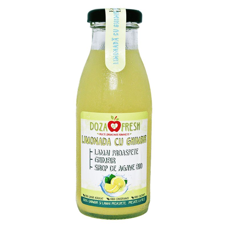 Limonada naturala din lamai proaspete presate la rece. Produs usor pasteurizat si imbuteliat in ambalaj de sticla de 250ml, cu termen de valabilitate de 90 de zile. Fara adaos de zahar, fara concentrat, fara coloranti, fara aditivi. Contine: lamai, ghimbir, sirop de agave, apa purificata.