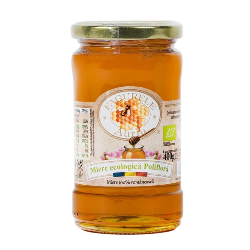 Miere ecologica poliflora, obtinuta din nectarul mai multor flori, cu gust echilibrat si aroma naturala. Formatul de 400g, in bax de 6 bucati, este ideal pentru vanzare constanta in retail.