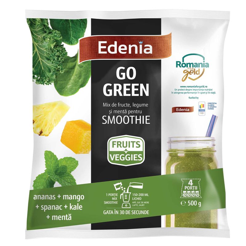Mix echilibrat de fructe (ananas, mango), legume (spanac, kale) si plante aromatice (menta), curatate, taiate si congelate rapid. O punga contine 4 portii de fructe, legume si plante aromatice pentru smoothie a cate 125g.