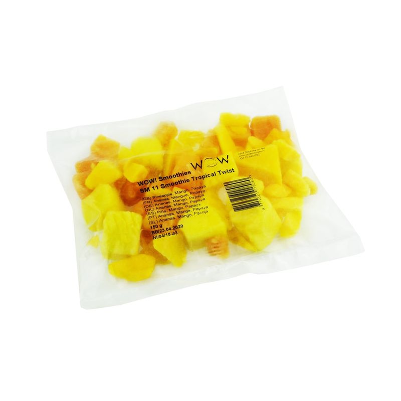 Mix fructe smoothie cu cu papaya, mango si ananas, realizat dintr-o combinatie echilibrata de fructe atent selectionate. Produs cu gust exotic, aroma vibranta si textura omogena, potrivit pentru consum direct sau utilizare in meniuri HoReCa (mic dejun, bufet, bar). Ambalaj individual de 150 g, baxul contine 33 bucati.