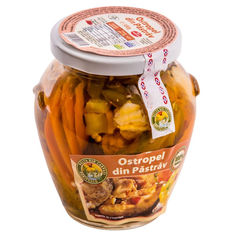 Pastrav picant Doripesco – marinata cu legume si condimente aromate, fara conservanti, picant si cu o aroma unica data de amalgamul de legume: morcovi, castraveti, ardei iute, masline verzi, usturoi si condimente speciale boia dulce, boia iute, piper mozaic.