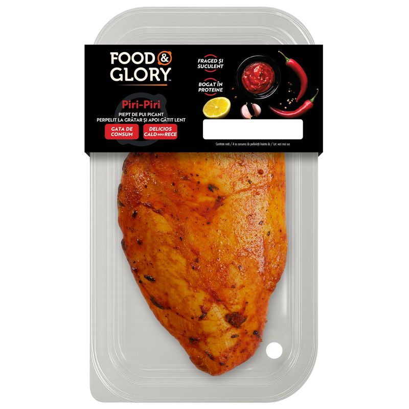 Piept de pui dezosat fara piele 97%, arome, ulei de floarea soarelui, condimente in proportii variabile (ardei iute (chili), extract de boia dulce, piper negru, cimbru), sare, usturoi, ceapa, dextroza, pudra de rosii, concentrat din lamaie, otet din vin alb, lecitina din floarea soarelui.