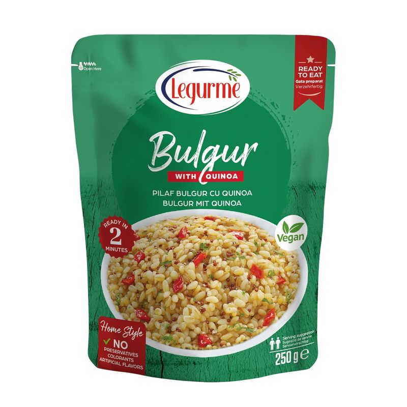 Pilaf din bulgur si quinoa, preparat cu ingrediente naturale, fara prelucrari intensive. Combinatia asigura un continut nutritiv ridicat si un gust echilibrat. Produs potrivit pentru meniuri vegetariene, de post sau ca garnitura pentru preparate diverse.