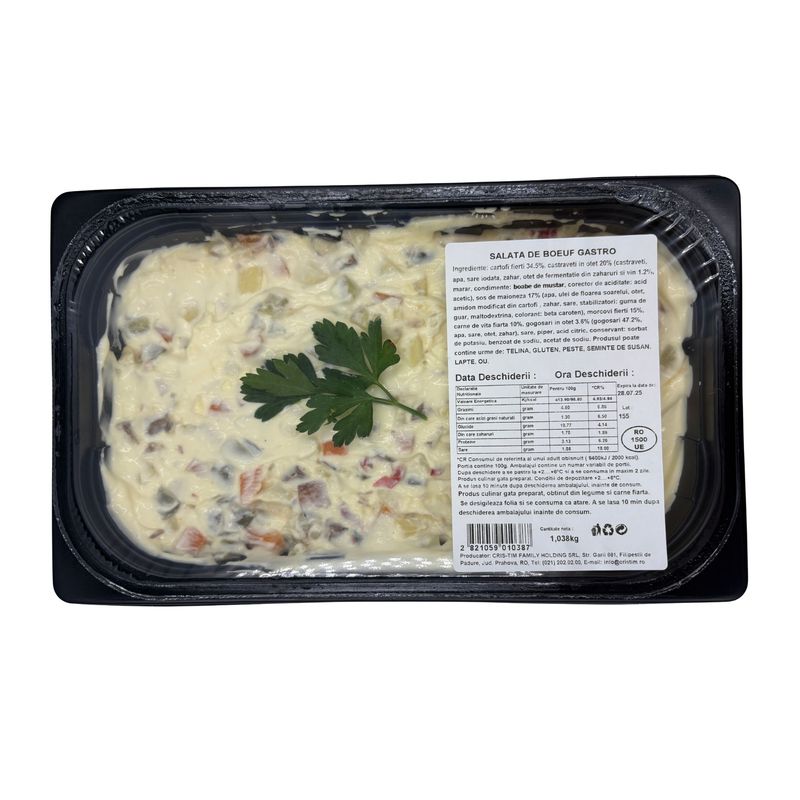 Produs culinar gata preparat, obtinut din legume si carne fiarta. Realizata dupa o reteta clasica din cubulete de legume, muraturi si bucati de carne de vita, alaturi de sos de maioneza.