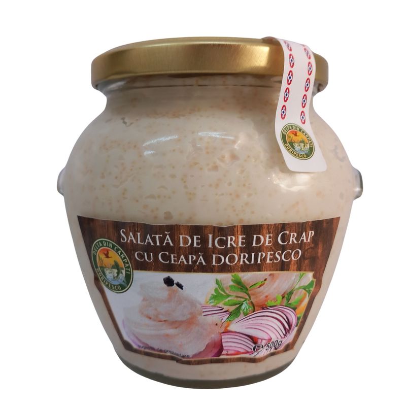 Traditie din Depresiunea Barsei: icre de crap Doripesco, preparate cu ulei, ceapa, sare si lamaie, pentru gust autentic.