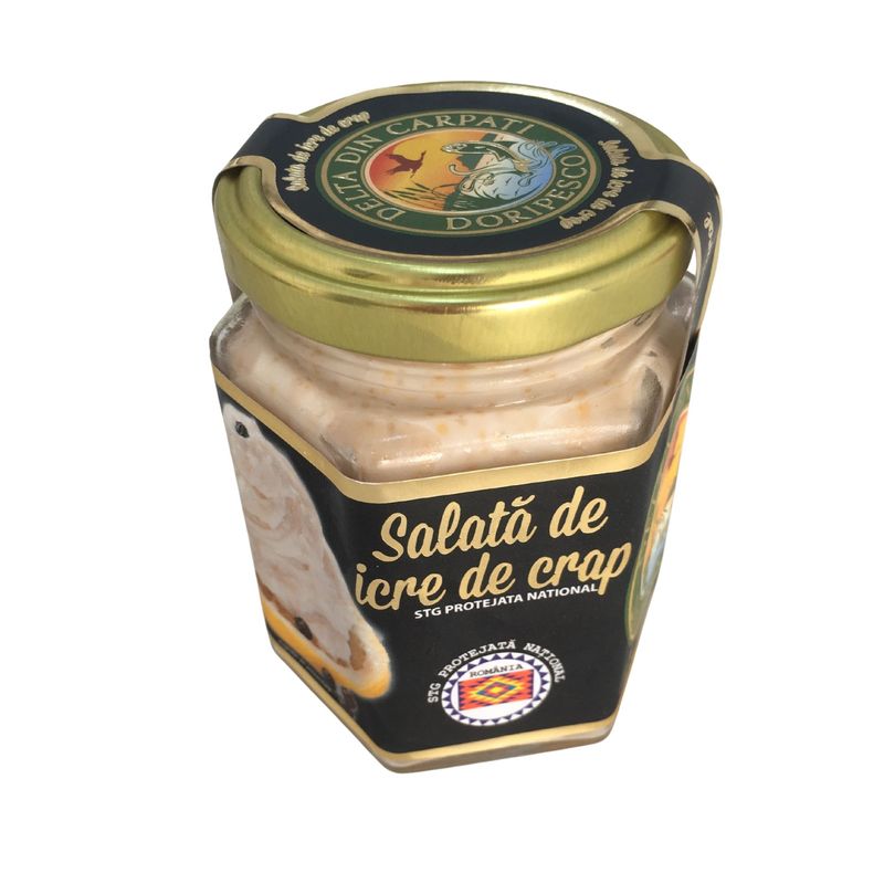 Ulei de floarea soarelui, ICRE DE CRAP sarate 12.5% (Cyprinus carpio), mix ICRE peste de apa dulce sarate 12% ( ICRE de la specii din familia Ciprinidae, Percidae, Bramidae), apa carbogazificata, zeama de lamaie.