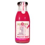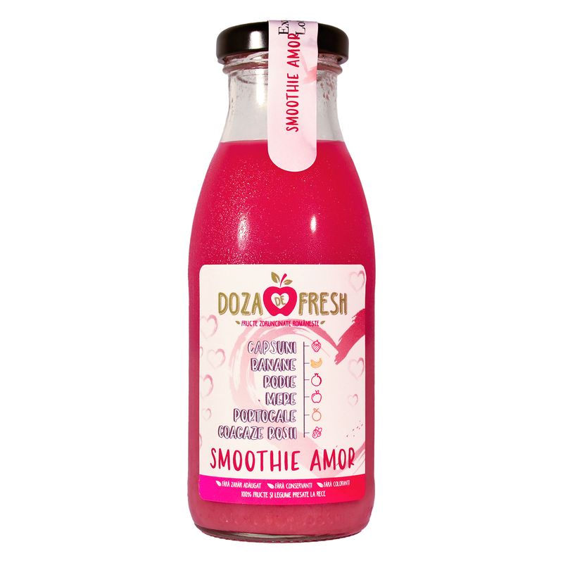 Smoothie natural din 100% fructe si legume presate la rece. Produs usor pasteurizat si imbuteliat in ambalaj de sticla de 250ml, cu termen de valabilitate de 90 de zile. Fara adaos de zahar, fara concentrat, fara coloranti, fara aditivi. Contine: capsuni, banane, rodie, coacaze rosii, portocale, mere, sfecla rosie.