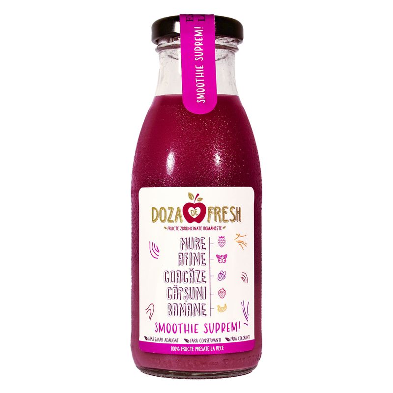 Smoothie natural din 100% fructe si legume presate la rece. Produs usor pasteurizat si imbuteliat in ambalaj de sticla de 250ml, cu termen de valabilitate de 90 de zile. Fara adaos de zahar, fara concentrat, fara coloranti, fara aditivi. Contine: mure, afine, coacaze negre, coacaze rosii, capsuni, banane, mere.