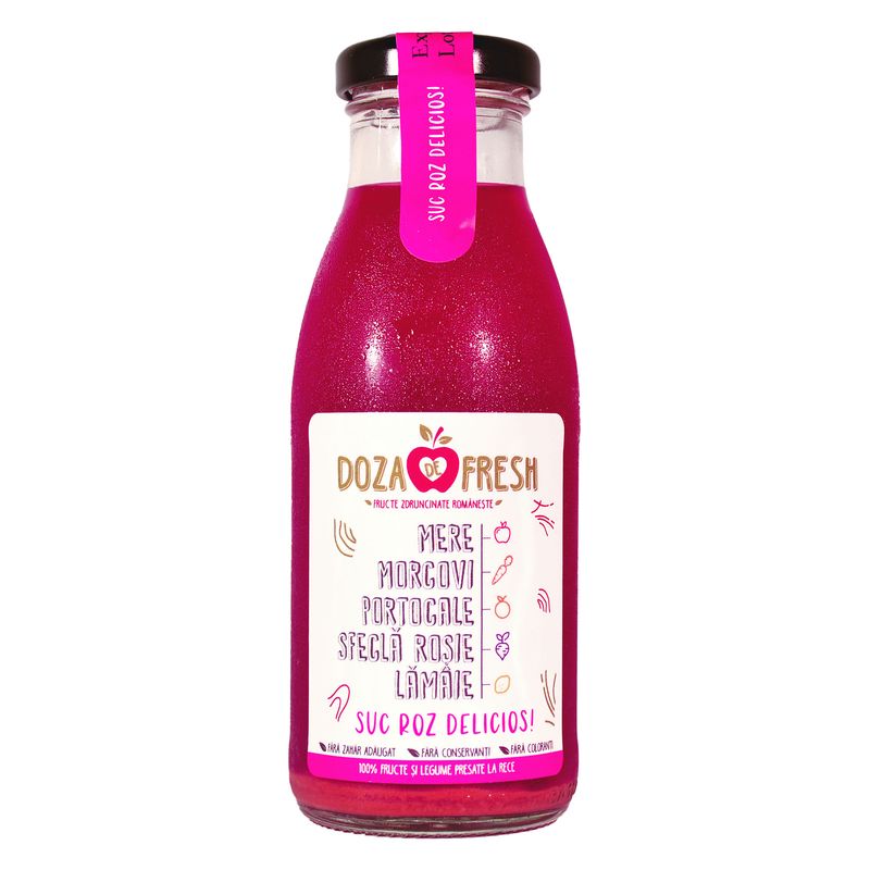 Suc natural din 100% fructe si legume presate la rece. Produs usor pasteurizat si imbuteliat in ambalaj de sticla de 250ml, cu termen de valabilitate de 90 de zile. Fara adaos de zahar, fara concentrat, fara coloranti, fara aditivi. Contine: mere, morcovi, portocale, sfecla rosie, lamaie.