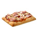 Faina de GRAU, piure de rosii 13%, apa, branza mozzarella 11% (LAPTE, sare, cheag), sunca gatita 8% (carne de porc, apa, sare, dextroza, antioxidant: ascorbat de sodiu, conservant: nitrit de sodiu, extract de condimente ), ciuperci Champignons la gratar 8% (ciuperci cultivate „Agaricus bisporus” 70%, ulei de floarea-soarelui, sare, usturoi, patrunjel, regulator de aciditate: acid lactic, antioxidant: acid ascorbic), faina de orez, ulei de masline extravirgin, sare, ulei de masline, drojdie, zahar, busuioc.
