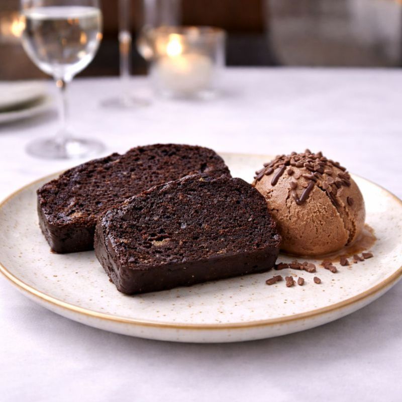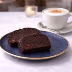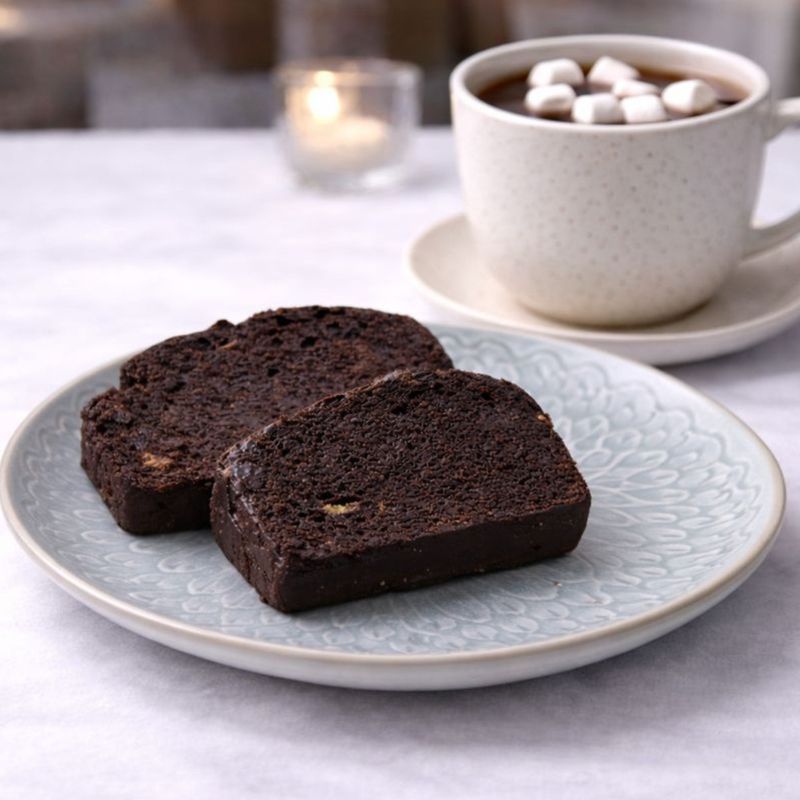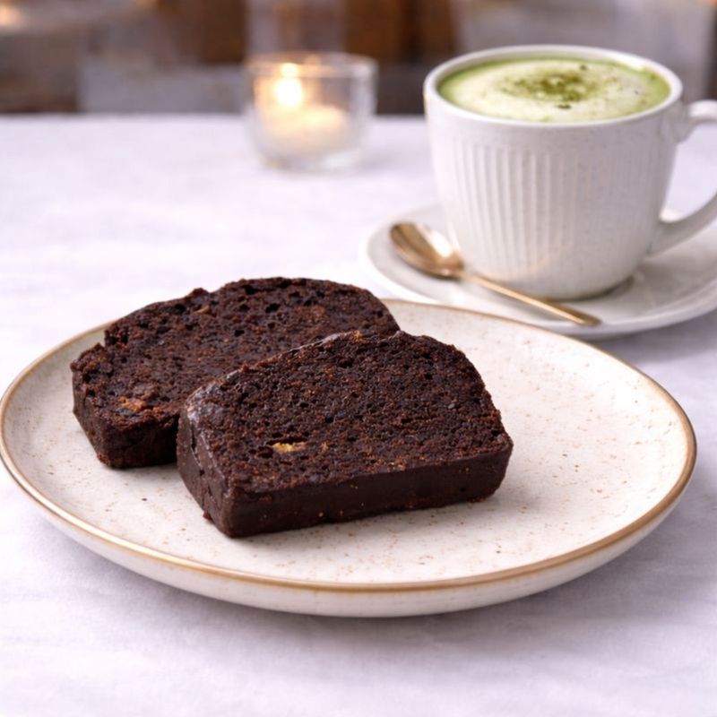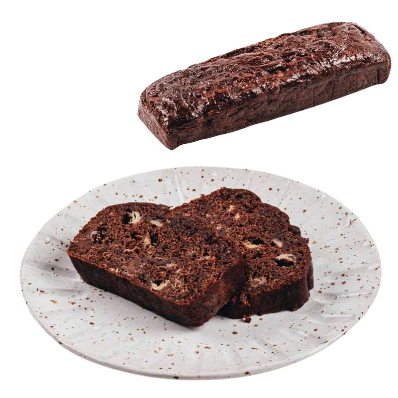 Banane 42%, faina alba de GRAU, zahar brun, unt de ARAHIDE, bautura pe baza de plante [apa, proteina din SOIA orez, ulei vegetal de rapita, OVAZ, migdale, acidifianti: fosfat de potasiu, carbonat de calciu, sare de mare, aroma naturala, vitamina D, vitamina B2 (riboflavina), vitamina B12], suc de portocale, cuvertura de ciocolata neagra [(72% substanta uscata de cacao): masa de cacao, zahar, unt de cacao, emulsifiant: lecitina de floarea soarelui, aroma naturala de cacao], ulei de floarea soarelui, cacao 3%, faina din seminte de in, ulei de cocos, esenta de rom, sare, nes* (cafea solubila), praf de copt, bicarbonat.